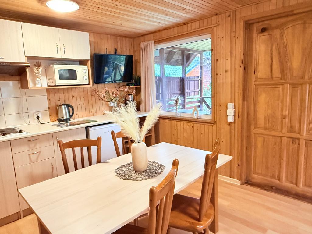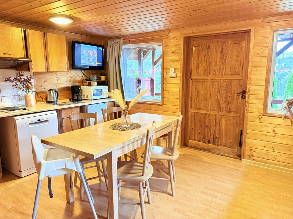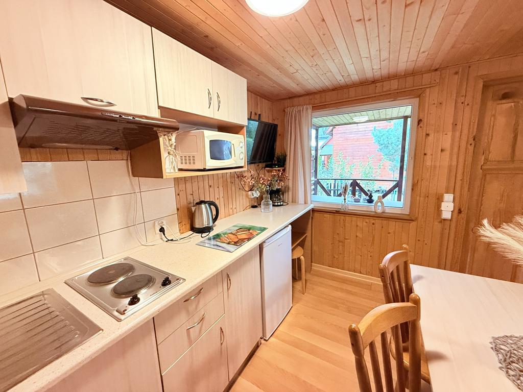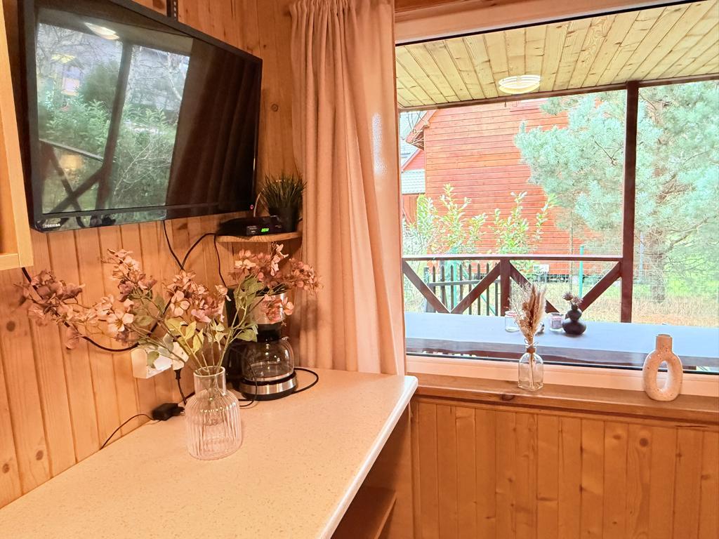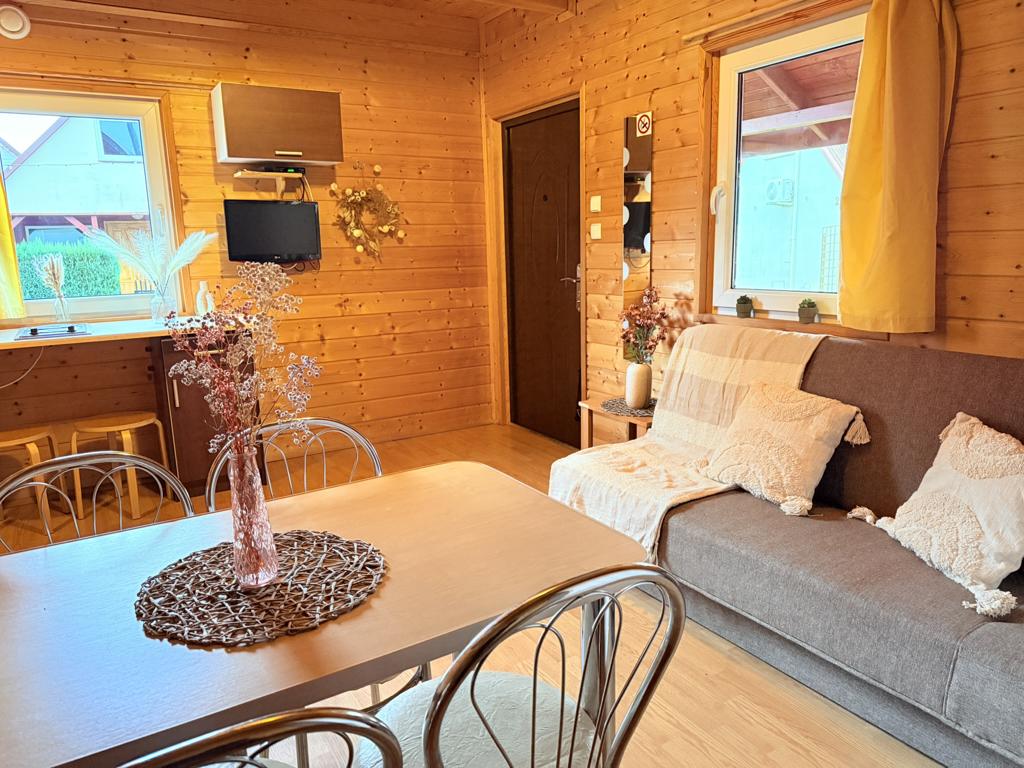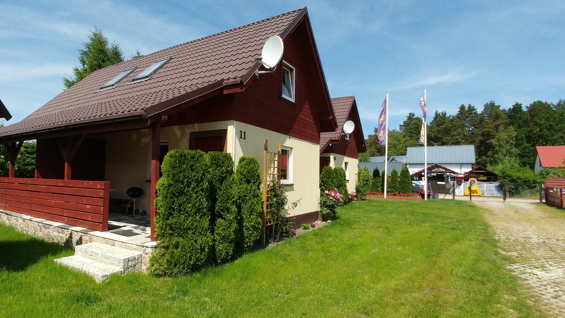 Dodatkowo dostępny jest telewizor z programami SAT, mikrofalówka, lodówka, czajnik oraz wentylator. W wybranych domkach czeka także klimatyczny kominek – idealny na chłodniejsze wieczory.